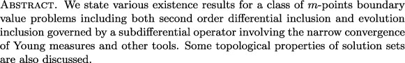 Biting lemma, contraction, epiconvergence, evolution, inclusion, m-points boundary, narrow convergence, retract, second dual, second order, Young measures