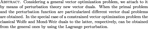 Extending the classical vector Wolfe and Mond-Weir duality concepts via perturbations (JNCA) |