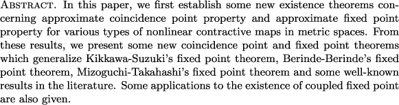 | MT-function, R-function, function of contractive factor, Kikkawa-Suzuki's fixed point theorem, Berinde-Berinde's fixed point theorem, Mizoguchi-Takahashi's fixed point theorem, approximate fixed point property, approximate coincidence point property, coupled fixed point |