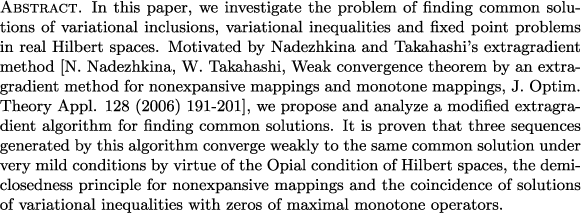 | Weak convergence theorem by a modified extragradient method for variational inclusions,variational inequalities and fixed point problems (JNCA) |