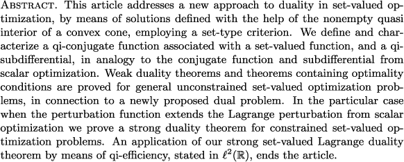 Set-valued optimization, duality, set criterion, quasi interior, optimality conditions