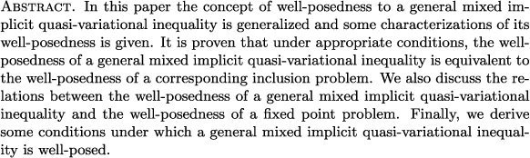 | Well-posedness of general mixed implicit quasi-variational inequalities, inclusion problems and fixed point problems (JNCA) |