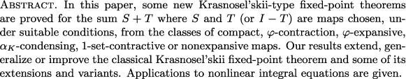 | Fixed point, compact map, $\alpha_K$-condensing map, 1-set-contractive map, $\varphi$-contraction, $\varphi$-expansive map; nonexpansive map, solution of nonlinear integral equation, Banach space |