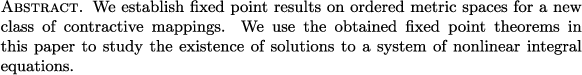 | Fixed point results on ordered metric spaces and existence of solutions to a system of nonlinear integral equations |
