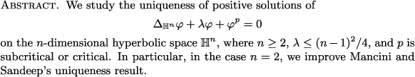 Uniqueness, positive solutions, hyperbolic space, Pohozaev identity