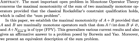 Constraint qualification, convex function, convex set, Fitzpatrick function, maximally monotone operator, monotone operator, normal cone operator, operator of type (FPV), subdifferential operator, sum problem