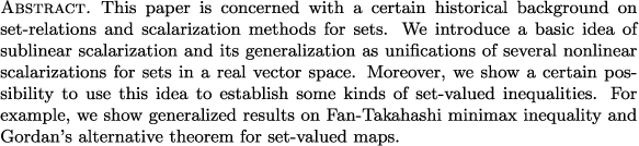 Sublinear scalarization, set relation, set-valued map, cone-convexity, cone-continuity, Fan-Takahashi minimax inequality, alternative theorem.