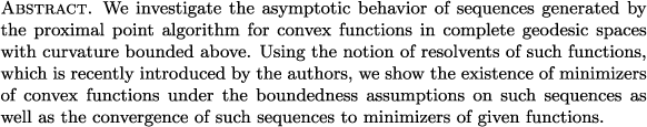 CAT(1) space, convex function, fixed point, geodesic space with curvature bounded above, minimizer, proximal point algorithm, resolvent