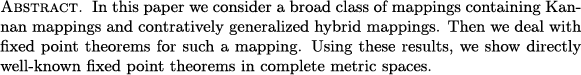 | Fixed point theorem, contractive mapping, Kannan mapping, contractively nonspreading mapping, contractively hybrid mapping, contractively generalized hybrid mapping, contractively widely more generalized hybrid mapping, metric space |
