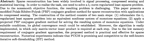 | sparse reconstruction, l 1-norm regularized least squares, compressed sensing, monotone equations, projected conjugate gradient method |