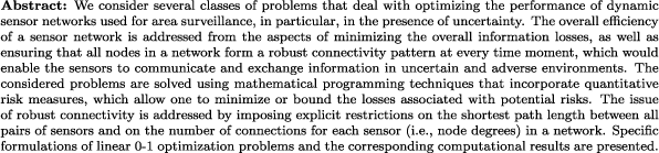 | Robust connectivity issues in dynamic sensor networks for area surveillance under uncertainty (PJO) |