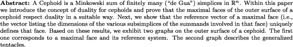 | Minkowski sum, de Gua simplexes, cephoids, number of facets, bargening |
