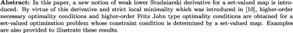 | weak lower Studniarski derivative, strict local minimality, higher-order optimality conditions, set-valued optimization |