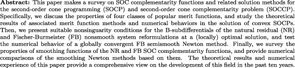 second-order cone, complementarity functions, merit functions, smoothing function, nonsmooth Newton methods, smoothing Newton methods
