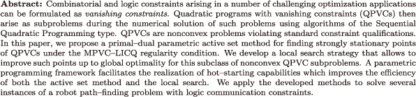 | mathematical programs with vanishing constraints, parametric quadratic programming, active set methods, robot motion planning |