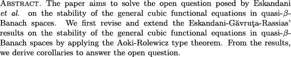 Nguyen Thi Thanh Ly and Ly Kim Ha: Answer to an open question on the stability of the general cubic functional equations in ~quasi-beta-Banach spaces (JNCA)