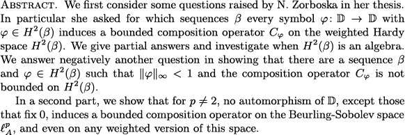 Pascal Lefevre, Daniel Li, Herve Queffelec and Luis Rodiguez-Piazza: On some questions about composition operators on weighted Hardy spaces (PAFA)