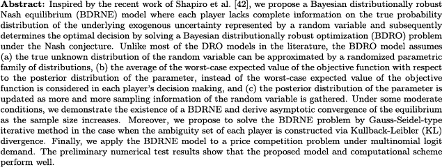 Jian Liu, Ziheng Su and Huifu Xu: Bayesian distributionally robust Nash equilibrium and its application (PJO)